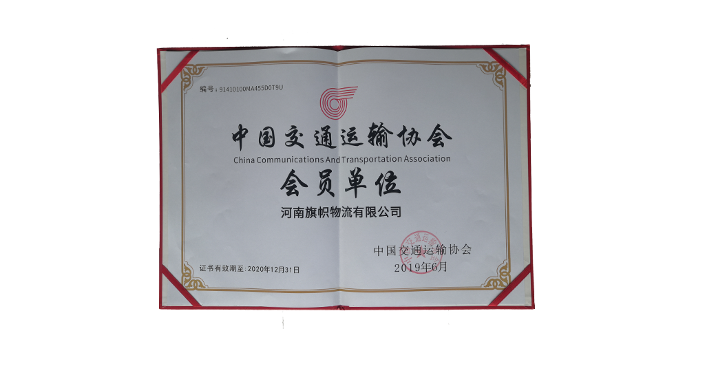 河南旗幟物流有限公司,(簡稱旗幟快運),于2019年六月正式被中國交通運輸協(xié)會列入中國交通運輸協(xié)會會員單位,并頒發(fā)交通會員協(xié)會會員單位榮譽證書。