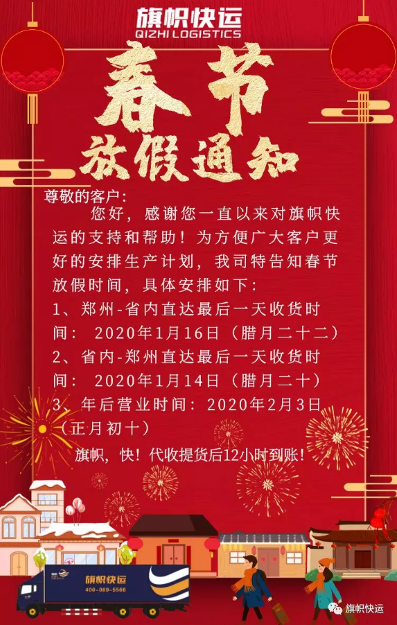 您好,感謝您一直以來對(duì)旗幟快運(yùn)的支持和幫助!為方便廣大客戶更好的安排生產(chǎn)計(jì)劃,我司特告知春節(jié)放假時(shí)間,具體安排如下: