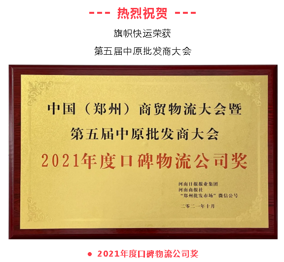 “2021年度口碑物流公司”獎(jiǎng)是客戶對(duì)旗幟品牌的信任和支持,也是對(duì)旗幟服務(wù)的肯定。未來,旗幟將繼續(xù)深耕物流業(yè),提升服務(wù)品質(zhì)為做中原物流旗幟而奮斗!
